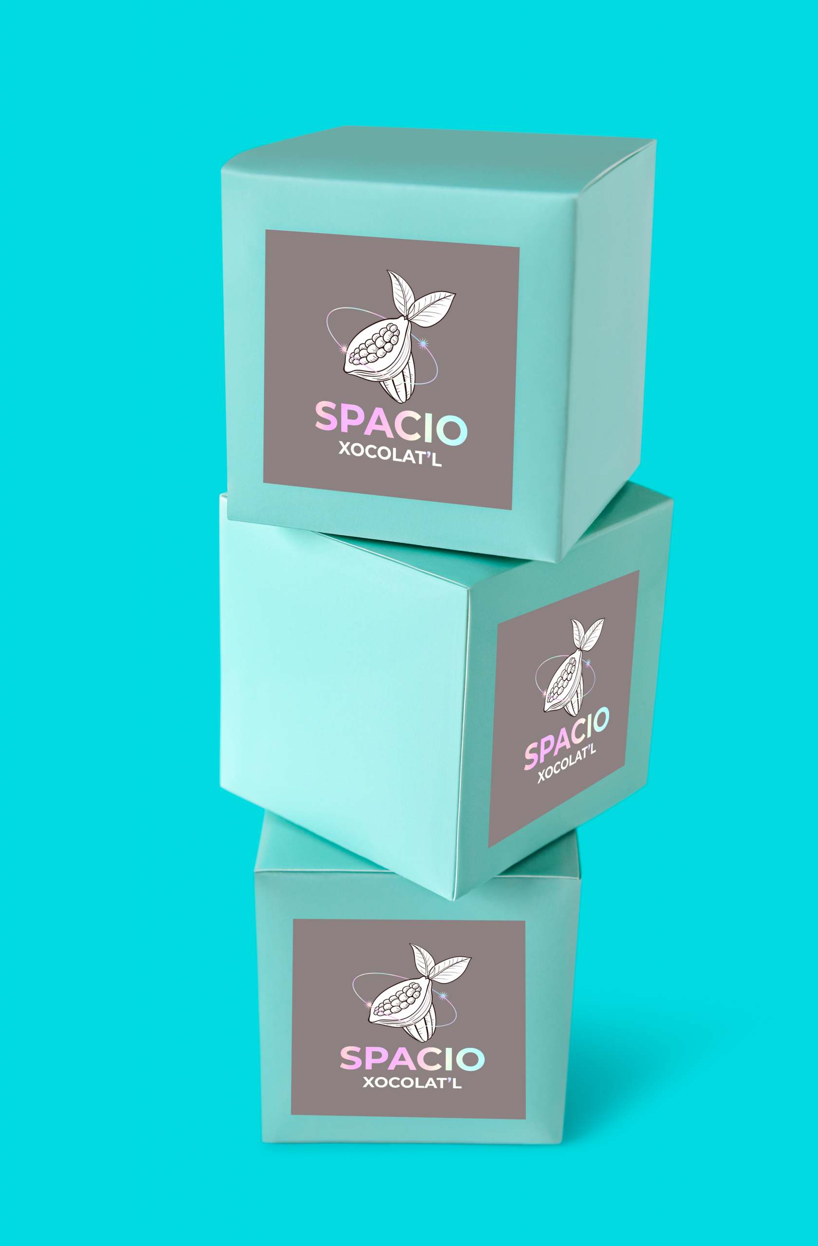 Is a branding and packaging design project for a premium chocolate brand. The concept centers around the idea of space and celestial bodies, creating a luxurious and otherworldly aesthetic. The logo features a cocoa pod, reminiscent of a planet, and the name “SPACIO” is a mix of the word in english “space” and the sound in spanish “ESPACIO”. The packaging design incorporates a minimalist, geometric approach with soft pastel colors and metallic accents, evoking a sense of elegance and sophistication.